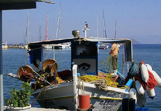 Die Atmosphäre in diesem Ort ist gemütlich. Keine Souvenierbuden, nur ein paar nette Tavernen und ein Bäcker am Hafenbecken. Der Hafen hat nun Platz für ca. 35 Yachten.