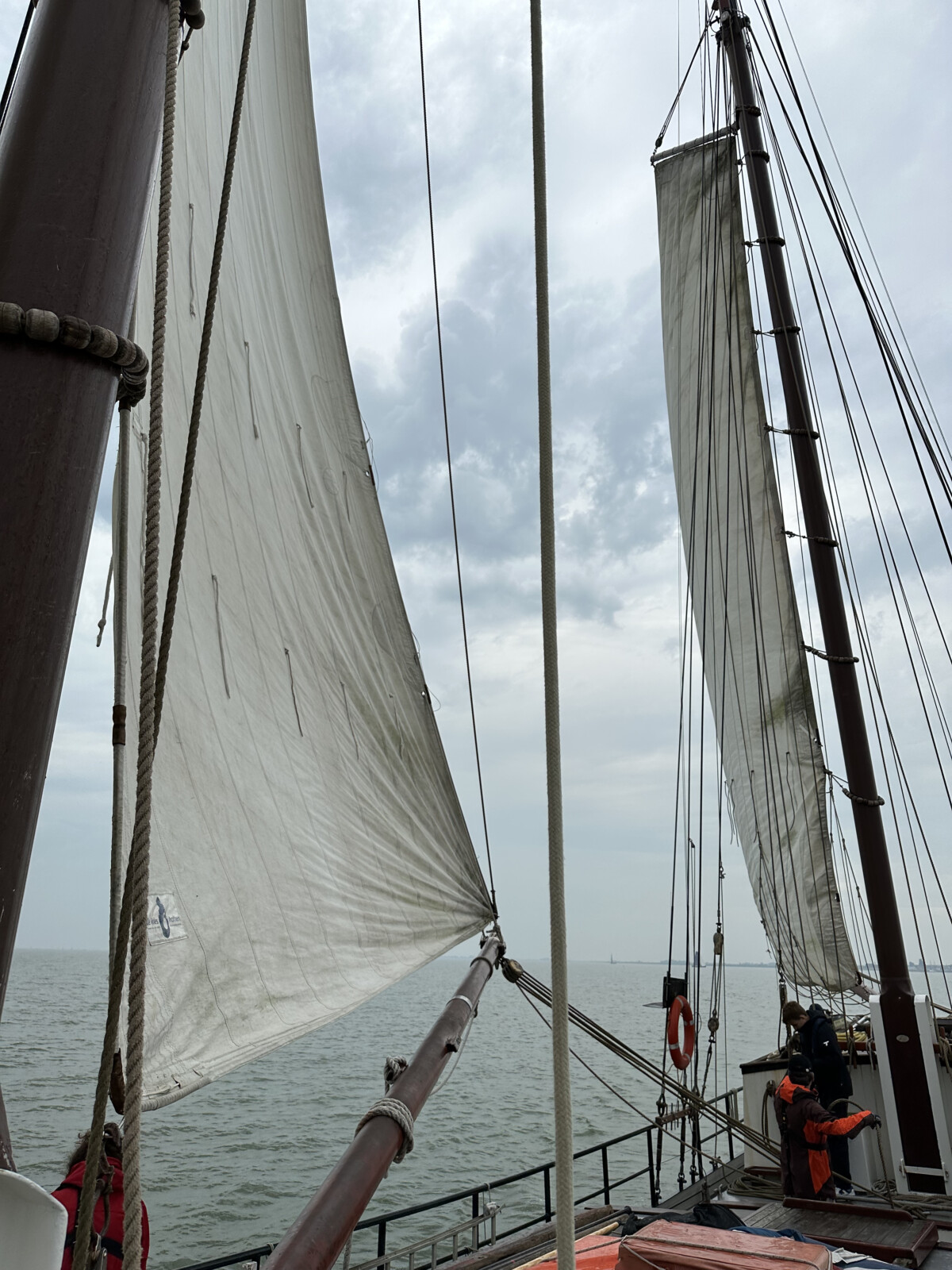 Mit Wind von Steuerbord ließen wir das Schwert an Backbord herunter und fuhren aus der Hafeneinfahrt heraus. Wir wählten einen nördlichen Kurs und setzten Besan, Baumfock und Klüverfock, um schneller voran zu kommen. Am Wind bauten wir gut Krängung auf, während das Mittagessen vorbereitet wurde. Kurz vor der Schleuse in die Nordsee aßen wir die wirklich leckere Bolognese mit Spagetti-Nudeln, bargen die Segel und warteten bis zur Durchfahrt vor der Schleuse.