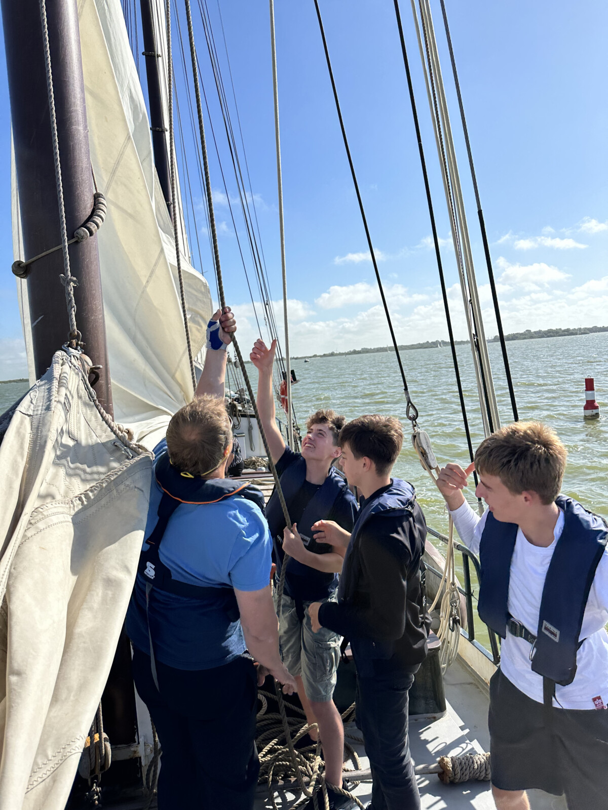 Am nächsten Morgen war um 8 Uhr Frühstück, dass bedeutete früh aufstehen. Wir Jugendlichen hatten das Glück, dass das Frühstück von den Erwachsenen zubereitet wurde. Es gab Brötchen mit verschiedenen Aufstrichen. Danach spülte ich zu zweit ab, während die anderen sich auf das Auslaufen vorbereiteten. Als es endlich losging, machten wir noch im Hafenbecken einen Aufschießer, und zogen das Großsegel hoch.