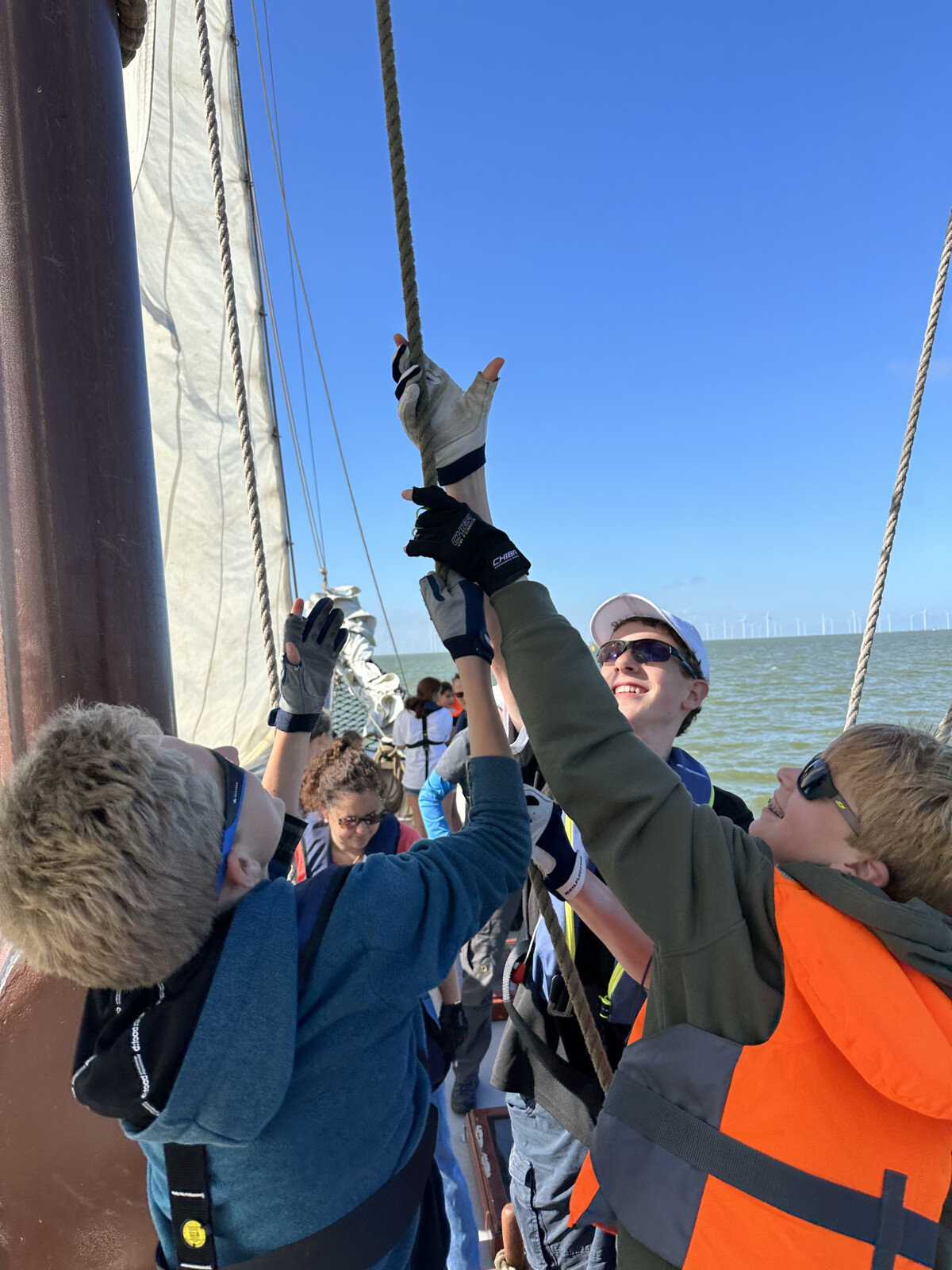 Am nächsten Morgen war wieder um 8 Uhr Frühstück, doch es ging erst später um 10 Uhr los. Zusammen übten wir noch in der übrigen Zeit Festmacherleinen zu werfen: Schwerer als gedacht! Nachdem wir aus der Hafeneinfahrt waren, waren die Segel schnell oben. Nach einem leckeren Erdbeerquark gab es zum Mittag Frikadellen im Brötchen. Nachmittag waren wir dann wieder im Heimathafen der Tjidgest angekommen, wir waren wieder in Stavoren. Nachdem alle Siebensachen wieder von Bord waren, ging es für alle auch schon wieder zurück nach Düsseldorf.