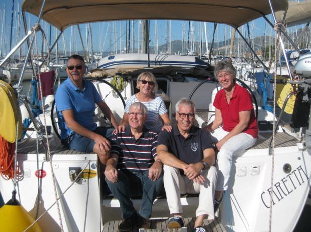 Praktisch, denn so wurden beim Einlaufen in den kleinen Hafen unsere Heckleinen von den Clubkameraden entgegen genommen. Kaum hatten wir die Muring aufgenommen und festgemacht, begann es stark zu regnen, wir konnten gerade noch rechtzeitig die Bimini und die Sprayhood hochziehen. Die Besatzungen der nach uns einlaufenden Boote waren patschnass. Der Regen wurde immer stärker, so dass wir wieder an Bord aßen, es uns gemütlich machten, Karten spielten und zu Ediths Akkordeonmusik nach einigen Gläsern Wein immer melodischer sangen.
