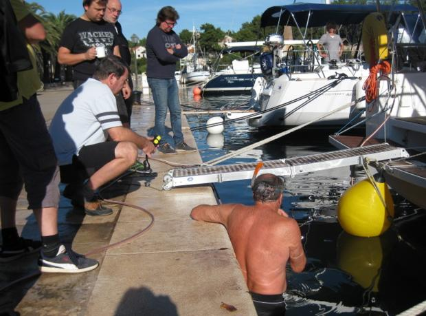 Es tat sich einiges dort unten. Bei einer kroatischen (?) Mannschaft wurde ein Mutiger im Bootsmannstuhl nach oben gezogen. Auch in unserer Flotille passierte etwas Unvorhergesehenes. Uwe musste nach einer Muring tauchen, die sich in der Schraube verfangen hatte. Beide Vorgänge fanden viel Beachtung bei uns Zuschauern.